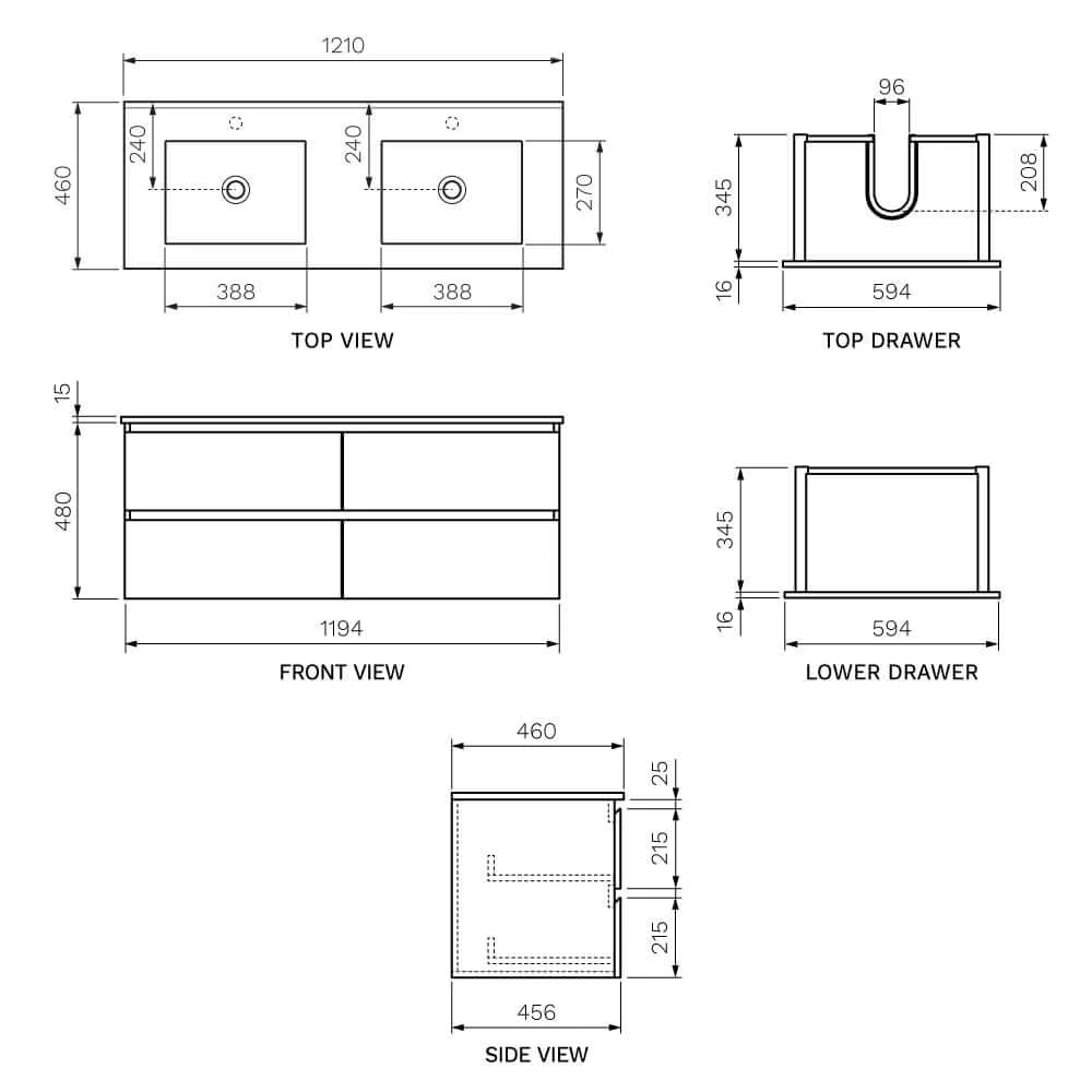 Parisi Evo 1200 Double Bowl Wall Mounted Vanity comes with matching laminate timber internal finish provides a stylish and sophisticated vanity. Double Bowl Parisi vanities are a stocked item which means the run around time is efficient.