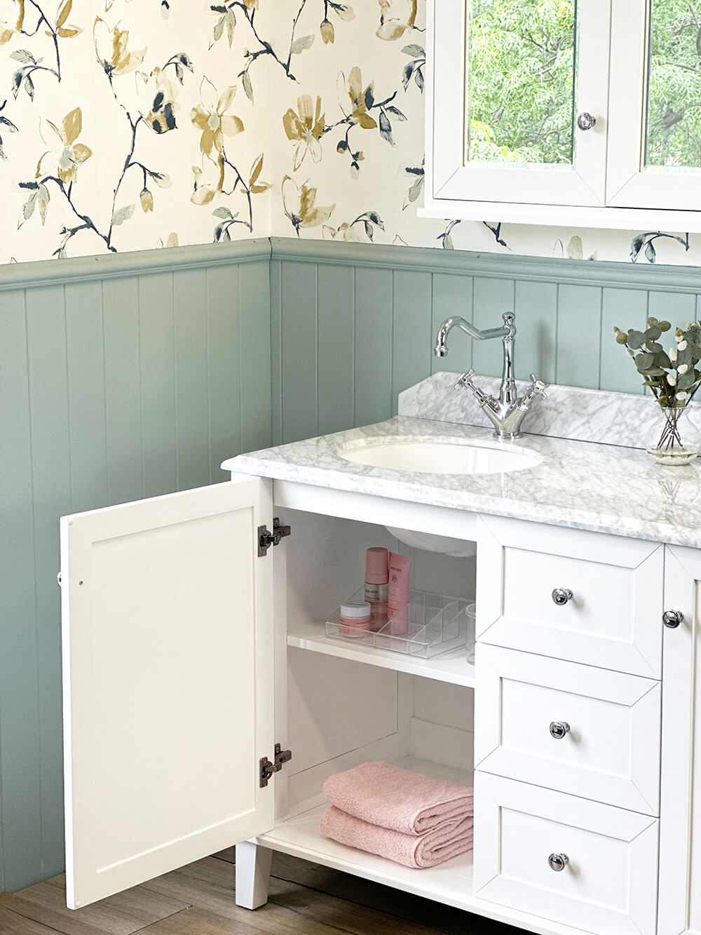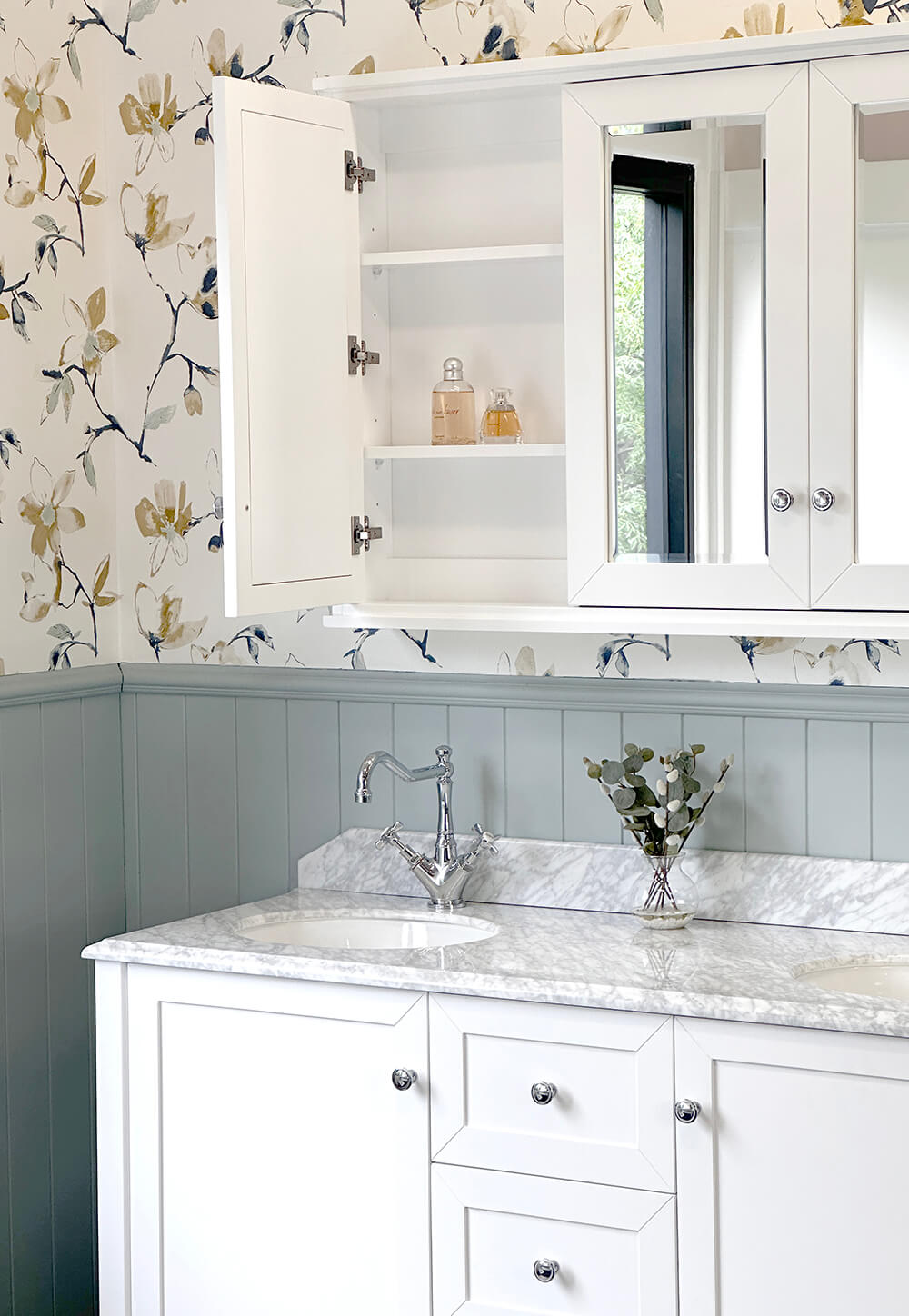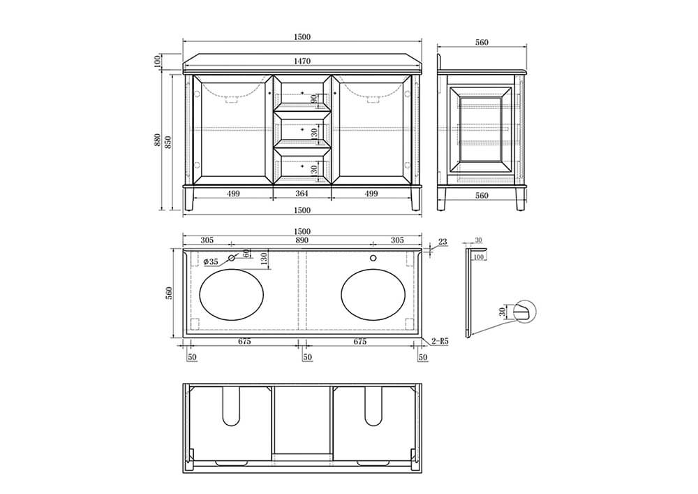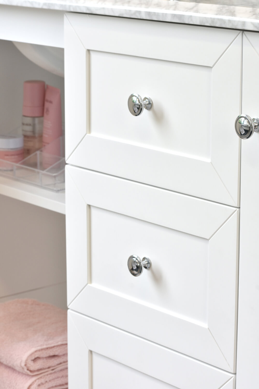 Coventry 150 x 56 Double Bowl Satin White Vanity with Real Marble Top & Ceramic Undercounter Basins. The two undermount bowls set in an Italian-sourced genuine marble top can come in 1 or 3 tap holes and includes 100mm high marble splashback.