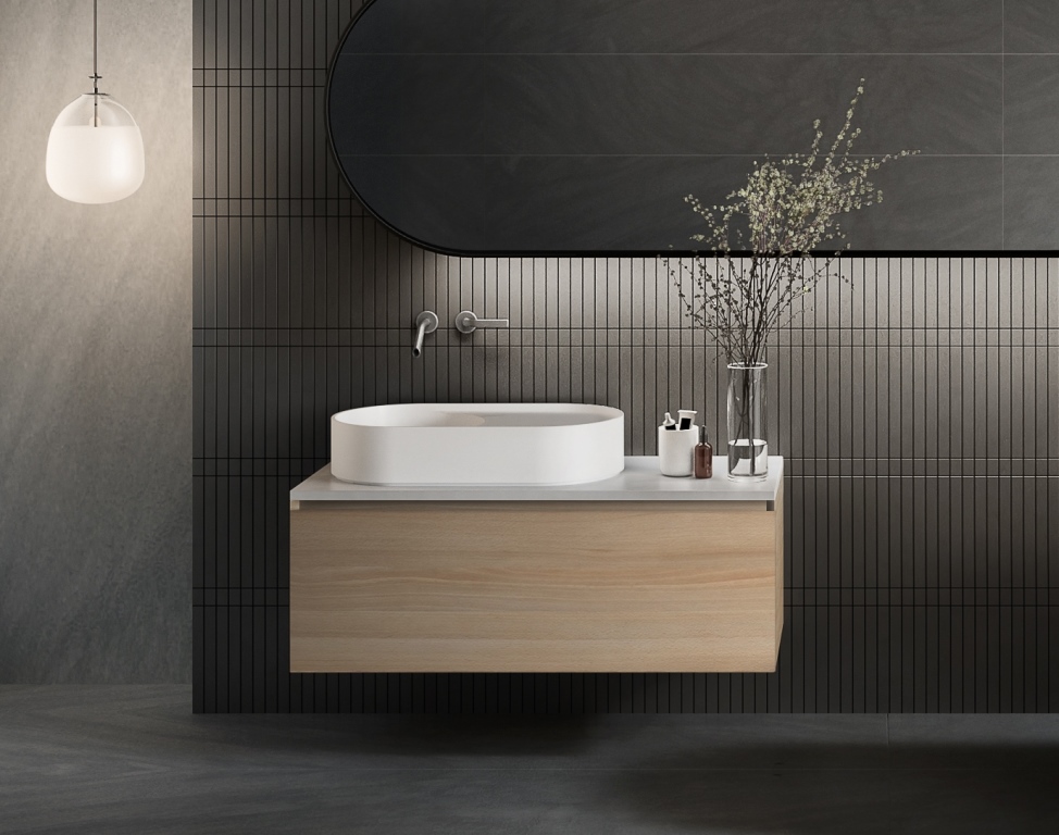 Omvivo Lune 750 Solid Surface Basin is designed by Adele Bates and has beautiful curved lines and a lovely Matt texture. It has the beautiful flexibility of being installed with an optional extra vanity.
