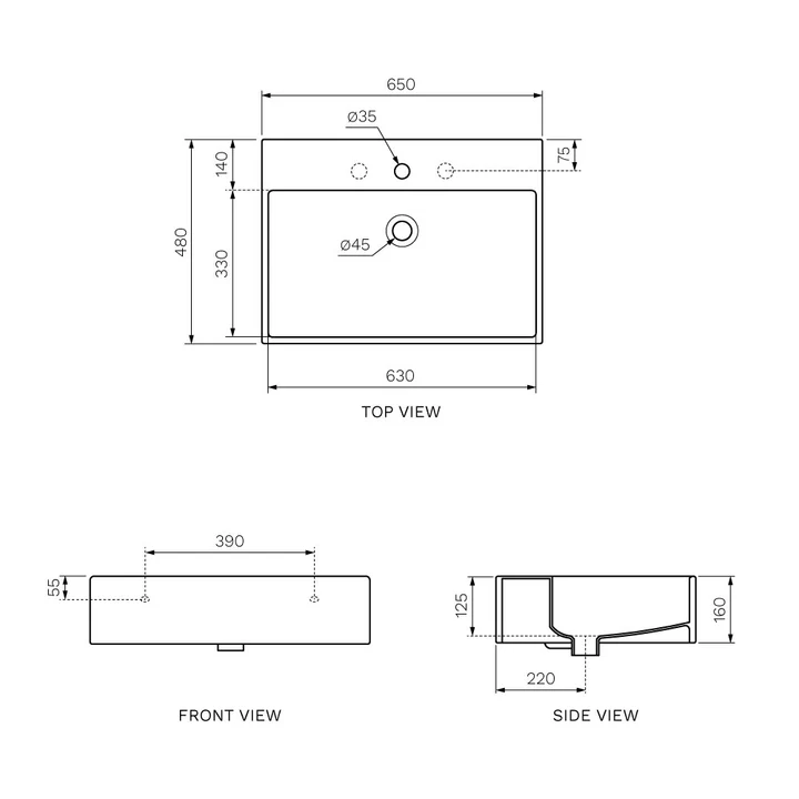 The Quadro 65 Bench Basin has a slimline rim with a stylish tap landing making this basin both functional and stylish. Note Basin is not glazed at rear.