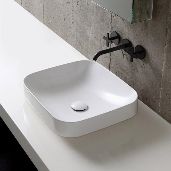 Studio Bagno Element 45 Bench BasinĀ is a smaller version that sits a squarer style with soft round edges. The element 45 can be installed on a bench or a vanity and works well with wall tapware and tapware from the basin that is extended.