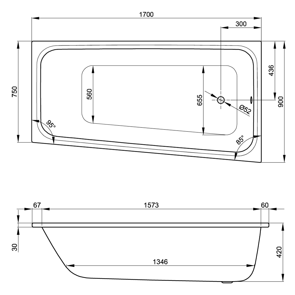 BetteBette Space L 1700 Drop in Steel Bath