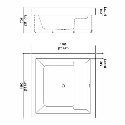 The spa versions features 24 jets for preheated air and the Idrocolore system for colouring the water – all adjustable via the keyboard control panel. It is constructed from re-inforced methacrylate and the size is 1800mm square.