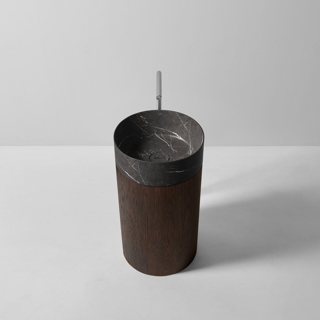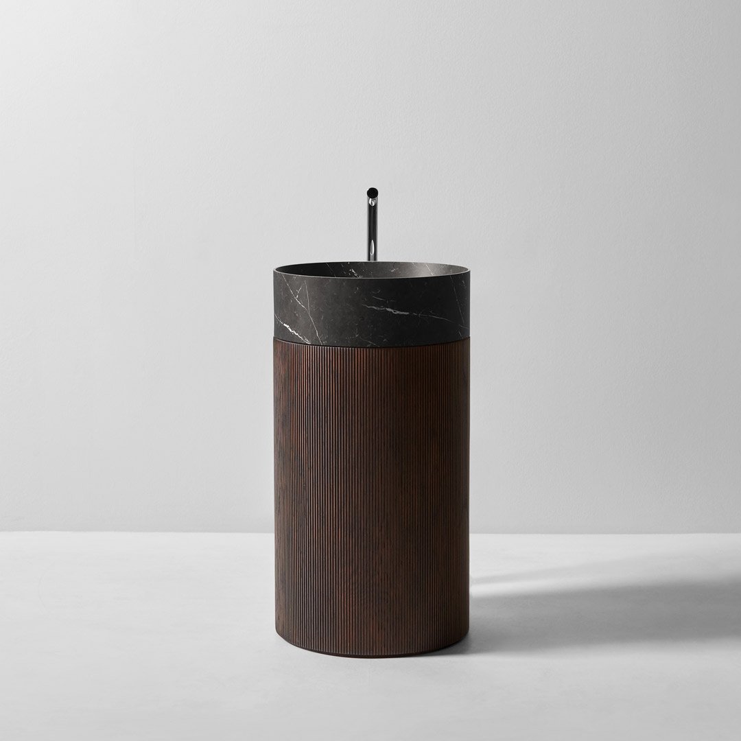 The Rigatino freestanding basin is a sophisticated study in contrasts. Designed by AL Studio, it moves away from the traditional smooth surfaces of the bathroom and embraces texture and touch. By pairing the weight and permanence of natural stone with the warmth and rhythm of fluted wood, the Rigatino creates a “furniture-like” feel that transforms a functional bathroom into a curated sanctuary.