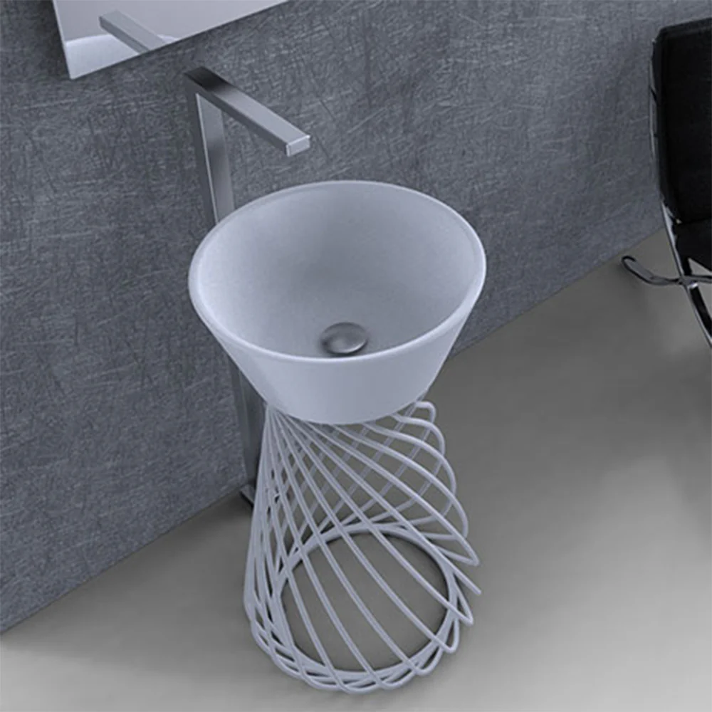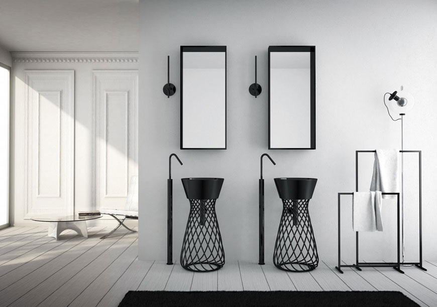 WIRE is a combination of two elements: the basin, that can be used as a countertop basin as well, and the column, made up from a circular array of 18 steel rods that gives the optical illusion of a meshwork.