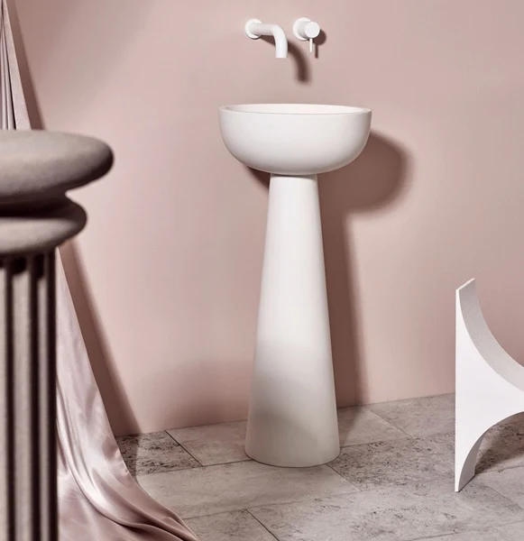 United Products Lunar Pedestal Basin is designed by Thomas Coward Studio and is made in a solid surface matt white. The hole can be either for the wall or floor hole.