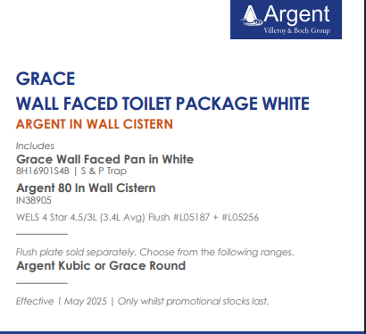 Argent Grace Wall Faced Toilet Package includes a toilet, cistern with the toilet buttons sold seperately. Argent Kubic or Grace Round plates are the options available to suit this cistern.