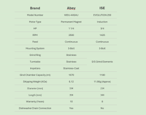 Table Comparison of Abey Enviro vs Insinkerator Evo 250