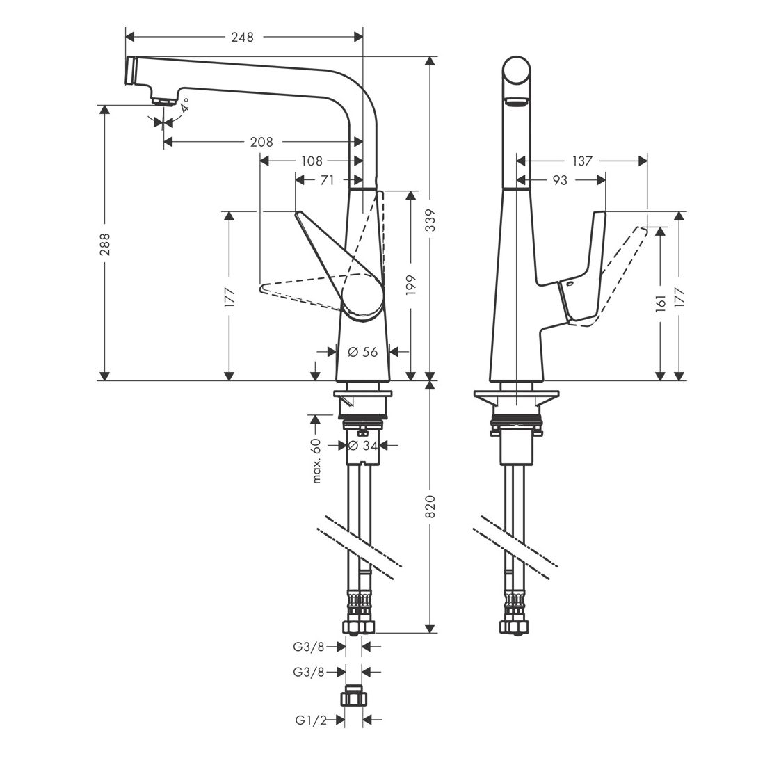 Hansgrohe Select Talis S 300 Kichen Mixer is a straight spout non pull out mixer made in Germany. The swivel range is adjustable in 3 steps 110°, 150° or 360° and the select button is used for a comfortable start/stop of the water flow. It is available for shipping Australia wide and can be purchased online. 15 year manufacturing warranty.