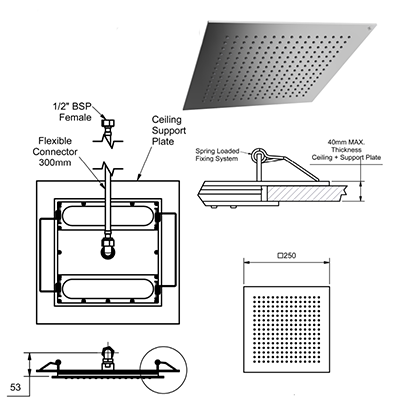 Ram Evolve Flushmount Square Shower Rose is 250mm wide metal shower. The shower is very lovely to stand under and should be no higher then 2.7m off the ground and is installed inside our directors own bathroom.