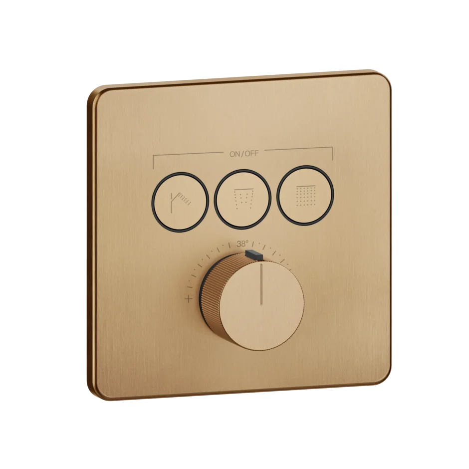Gessi Hi-fi Comfort thermostat mixer, three simultaneous functions, with on/off buttons.
