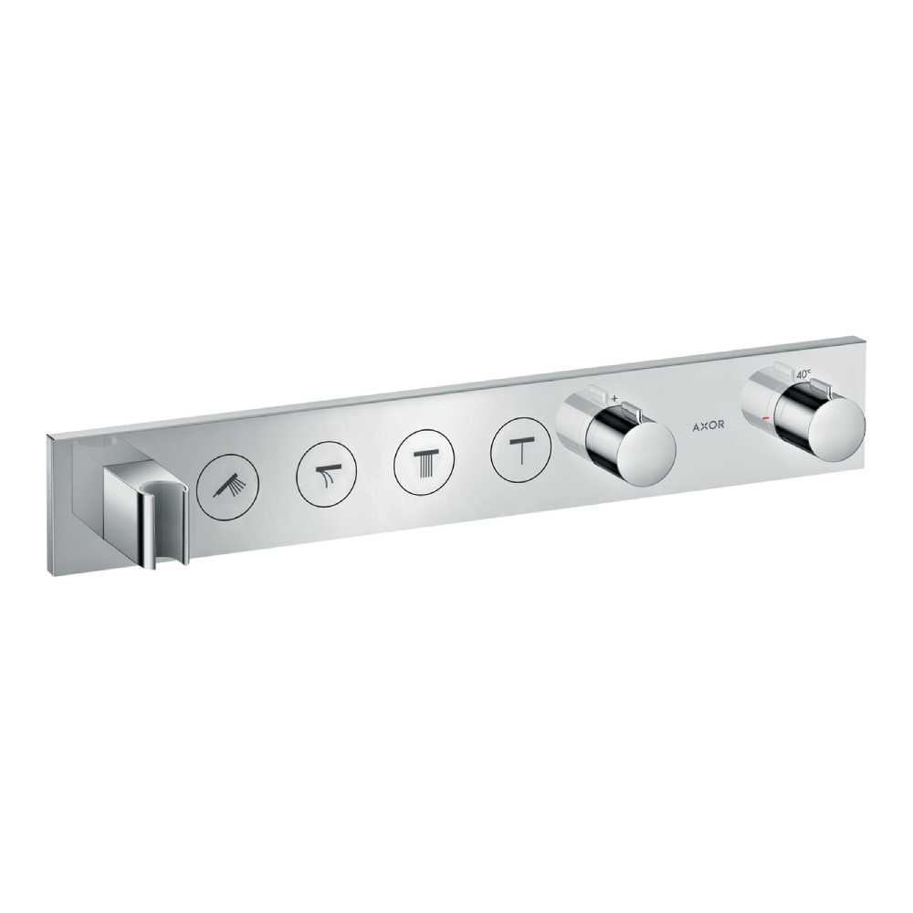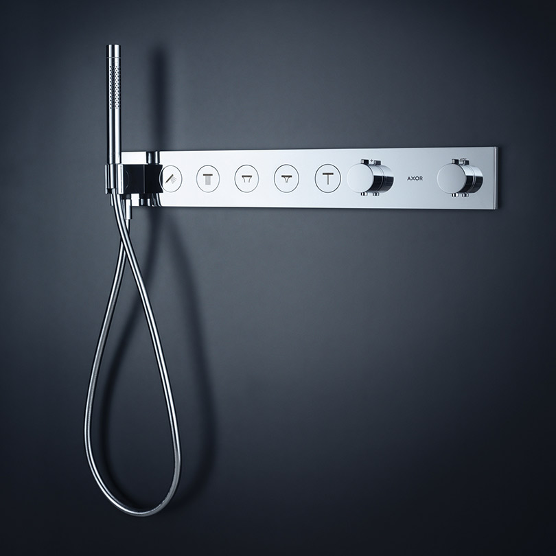 Axor Select Thermostatic Module for 4 Functions shower is a German made and engineered shower product. It controls a handshower and an Axor ShowerSolutions 3 jet shower of one plate. One knob will control water flow, one knob will control temperature. Each button can either divert water between each other or add to the function. So if you press the middle shower button and then the right shower select button, you will have three flows coming out of the one shower simultaneously. This product requires a basic set thermostatic module code 18312180
