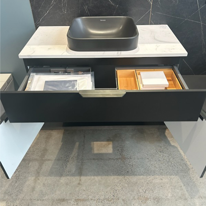 This vanity was upgraded to the platinum collection which includes a powerpoint in the drawer, bamboo divider shelves for storing and the highest grade Blum runners and soft close hinges/