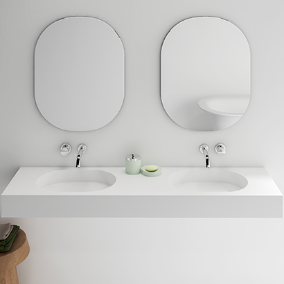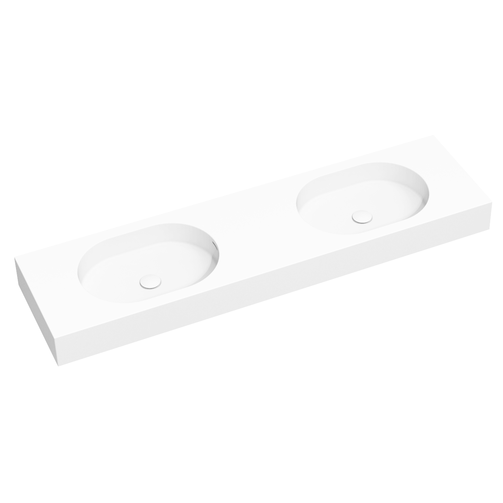 Omvivo Arki 1500 Double Basin is manufactured from solid surface which has a smooth matt finish that is durable and easy to maintain, ideal for residential and commercial applications. Arki 1500 can be wall mounted or installed on furniture. It can be ordered with or without a tap hole and is supplied with a polished chrome pop up plug and waste and wall mounting kit, white solid surface cap available to order.