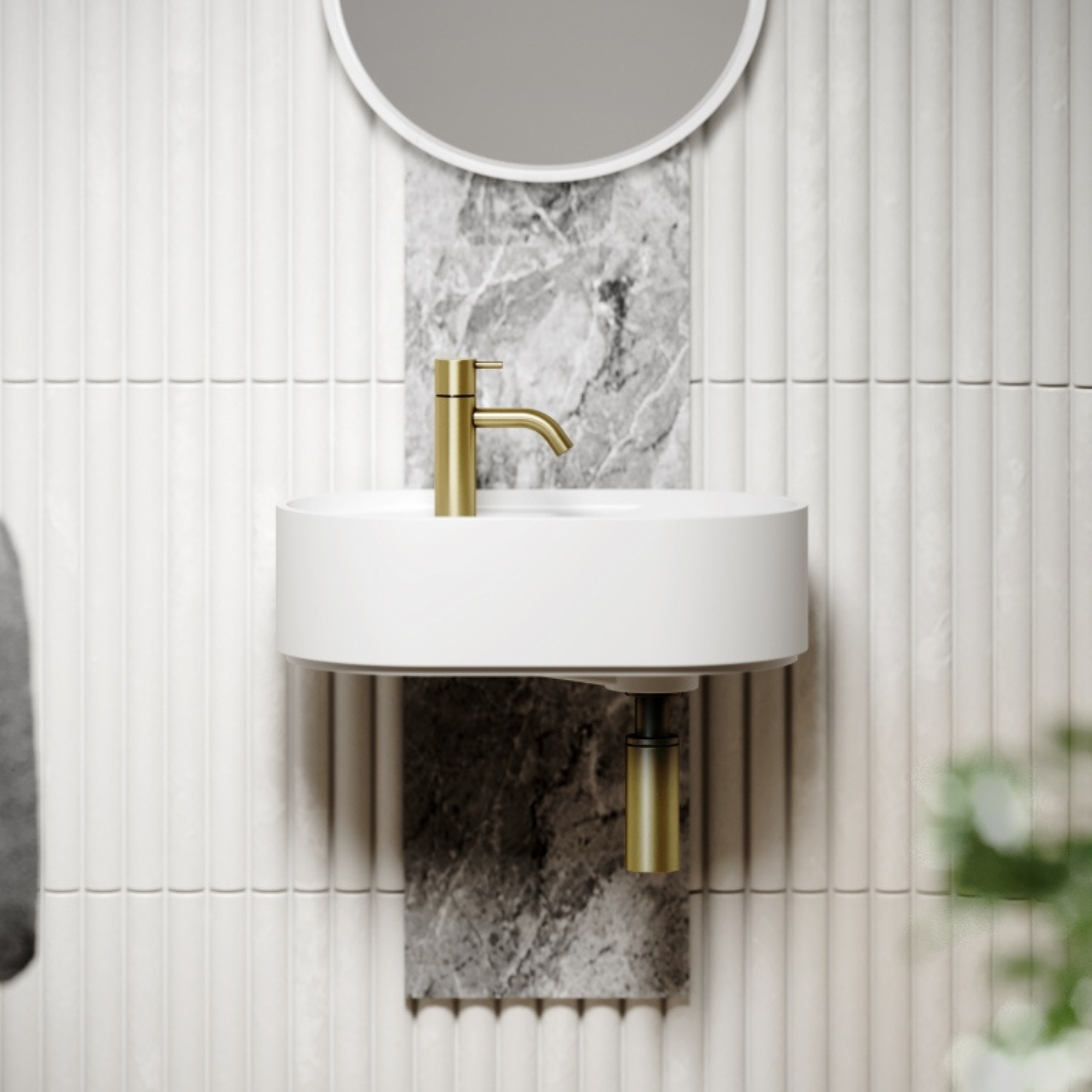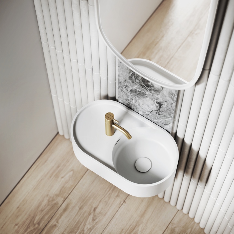 Omvivo Lune 510 Solid Surface Basin is designed by Adele Bates and has beautiful rounded forms with subtle shadow lines. The solid surface material from omvivo is hard wearing and offers a softness and subtle emotional texture to the bathroom. The basins specifications are a true masterpiece combining the balance between the perfect width with a compact depth and height suitable for a variety of applications. The basin can either be wall mounted or bench mounted with the bowl on the left or right hand side.
