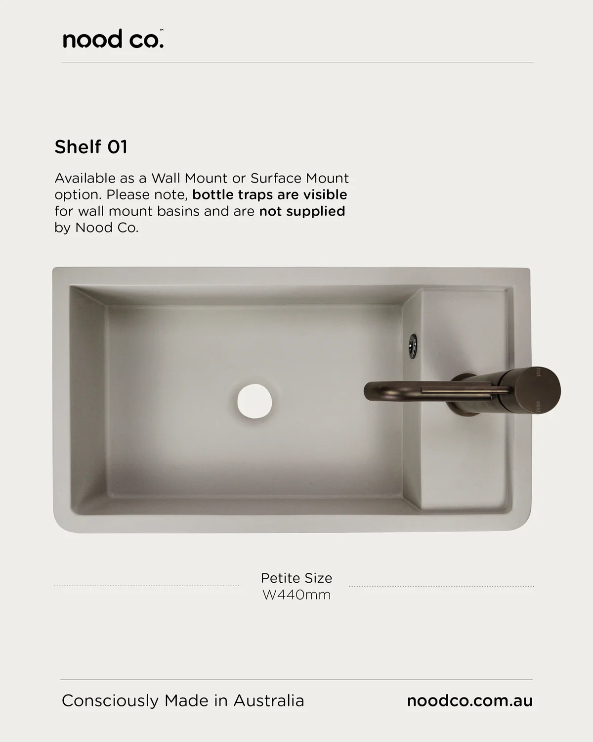 For tight spaces, powder rooms, hotel and apartment blocks this small Shelf basin has a space for soap or a tap hole, and a further option of overflow. Simple install after tiles, this basin ticks all the boxes. important note Assembly: Please install bracket direct to tiles ( post tiling ) Bracket, fixings and instructions provided per order.