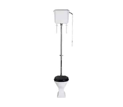 The Astoria Deco Toilets are a traditional toilet range which are now offered in 3 different cistern height levels. The flushing lever and the pull chain lever offer a completely unique traditional era feel to your bathroom and can be the anchor around your styling. The toilet seat comes in a bold black standard choice and is made from timber. It also comes in 2 different styles of wood colour and gloss white. The hinges from the toilet seat and the chrome piping can be coloured to match existing tapware.