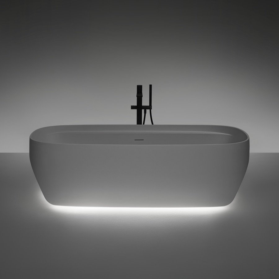 Antonio Lupi SLED Oval Flumood bathtub cuts angles and provides lighting if required to make the bath almost float in the air. The bath can be ordered with or without LED lighting. Sled is available in Flumood white resin or in Colormood in 10 colors from the antoniolupi range.